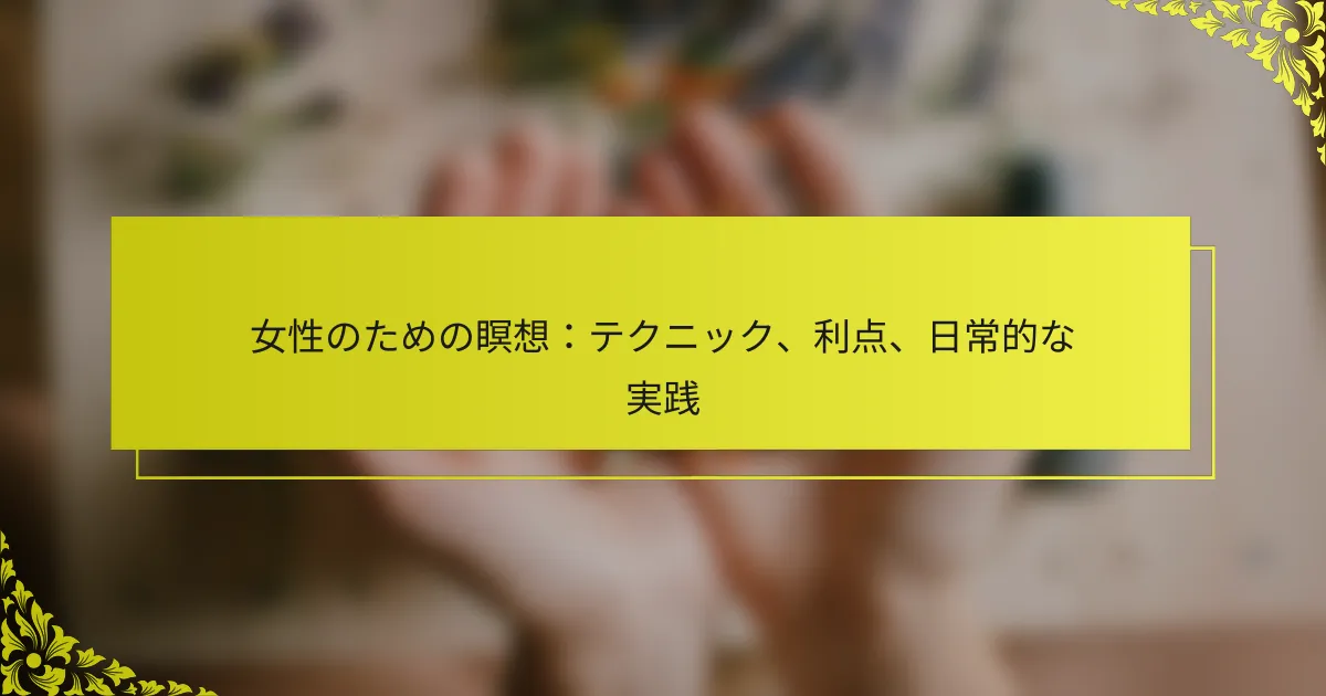 瞑想は女性の感情的なレジリエンスと精神的な明晰さを大幅に向上させることができます。この記事では、マインドフルネス、愛情深い親切、ガイド付きビジュアライゼーションなどのさまざまな技術を探ります。感情的な癒しやエンパワーメントを含む、女性のニーズに合わせた瞑想のユニークな利点を強調しています。日々の実践や専門家の洞察についても議論し、一貫した瞑想ルーチンを確立するのに役立てます。 女性のために特別に調整された瞑想の主要な技術は何ですか? 女性のための瞑想技術には、マインドフルネス、愛情深い親切、ガイド付きビジュアライゼーションが含まれます。これらの実践は、感情的な幸福感を高め、ストレスを軽減し、自己受容を促進します。マインドフルネスは現在の瞬間への意識を促し、愛情深い親切は自分自身や他者への思いやりを育みます。ガイド付きビジュアライゼーションは、特定の目標やリラクゼーションの達成を助けます。各技術は、女性の独自の感情的および精神的健康のニーズをサポートします。 ガイド付き瞑想は女性の体験をどのように向上させることができますか? ガイド付き瞑想は、感情的な幸福感を育み、自己受容を促進することで、女性の体験を向上させます。これは、社会的なプレッシャーやライフトランジションなど、女性が直面する独自のストレッサーに対処するための調整された技術を提供します。研究によると、ガイド付き瞑想を実践する女性は、リラクゼーションの増加と不安レベルの低下を報告しています。さらに、グループセッションの共同体的な側面は、社会的な絆を強化し、サポートや共有体験を提供します。定期的な実践は、精神的な明晰さの向上や自己との深い結びつきをもたらし、個人の成長にとって価値があります。 ビジュアライゼーションは女性の瞑想実践においてどのような役割を果たしますか? ビジュアライゼーションは、女性の瞑想実践を深めることで、より深い感情的なつながりと明晰さを育みます。これは、リラクゼーションや集中をサポートするメンタルイメージを作成することを可能にします。たとえば、穏やかな風景を視覚化することで落ち着きを呼び起こし、個人的な目標を思い描くことで動機付けやインスピレーションを与えることができます。この技術は、女性が瞑想の旅を効果的に進めるためのユニークなエンパワーメントを提供します。さらに、研究は、ビジュアライゼーションを取り入れることでストレスの軽減や感情的な幸福感が向上することを示しており、日常の実践において貴重なツールとなります。 女性の瞑想における呼吸法はどのように異なりますか? 女性の瞑想における呼吸法は、感情の解放とエンパワーメントを強調します。女性は独自のストレッサーを経験することが多く、呼吸法の技術は彼女たちのニーズにより調整されています。たとえば、実践は、育成、グラウンディング、女性エネルギーとのつながりに焦点を当てることがあり、全体的な幸福感を高めることができます。さらに、研究は、女性が呼吸パターンに異なる反応を示す可能性があることを示しており、瞑想における個別のアプローチの重要性を強調しています。 女性にとっての瞑想のユニークな利点は何ですか? 瞑想は、女性にとって感情的なレジリエンスの向上や精神的な明晰さの改善を含むユニークな利点を提供します。研究によると、定期的に瞑想を行う女性は、不安やストレスレベルが低下し、全体的な幸福感が促進されることが示されています。さらに、瞑想は自己受容を育み、女性がポジティブな自己イメージを育てることを可能にします。この実践は、身体的健康に不可欠な睡眠の質を改善することもできます。その結果、女性は瞑想を感情的および精神的健康のニーズをバランスさせるための貴重なツールと見なすことができます。 瞑想は女性のメンタルヘルスをどのようにサポートしますか? 瞑想は、ストレス、不安、うつ病を軽減することで、女性のメンタルヘルスを大幅に向上させます。定期的な実践は感情的なレジリエンスを育み、マインドフルネスを促進し、全体的な幸福感を向上させます。研究によると、瞑想を行う女性はコルチゾールレベルが低下し、これはストレスの軽減に関連しています。さらに、瞑想は自己慈悲を促し、感情の調整を強化し、メンタルヘルスサポートの強力なツールとなります。 女性が瞑想から得られる身体的健康の利点は何ですか? 瞑想は、ストレスの軽減、睡眠の質の改善、免疫機能の向上を含む、女性にとって多くの身体的健康の利点を提供します。定期的な実践は血圧を下げ、慢性的な痛みを和らげることができます。さらに、瞑想は感情的な幸福感を促進し、間接的に身体的健康をサポートします。研究は、瞑想を行う女性がストレス関連の症状を30%軽減するなど、より良い全体的な健康結果を経験することを示しています。…